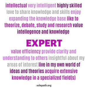 Being an Intellectual Expert means that you thrive on having intimate knowledge of your chosen field of interest. You never skim the surface but rather spend your time researching and specializing in the one or two topics that captivate you. The image is of a pyramid or triangle above your head, distilling the ideas and thoughts that flow from your research and learning into a peak of specialization.
