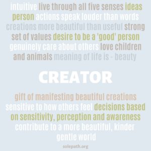 Being an Intuitive Creator means finding ways to make our world more beautiful; your life purpose is to leave our world more beautiful. Your very presence makes the world more beautiful and you have an uncanny ability to explore and share ideas that leave others feeling more beautiful. There is no limit to your creative ideas that include beautiful personal style, beautiful spaces and environments, beautiful experiences. Your greatest fulfillment is creating beauty in the world.
